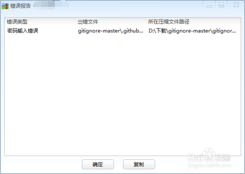 若是输入密码错误,就会弹出“错误陈述”的对话框,错误类型为“密码错误”,从而打不开压缩包