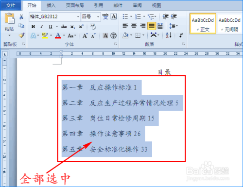 打开Word文档,先在文档中输入目次的内容和页码数,接着我们将内容和页码数全数选中。如图所示: