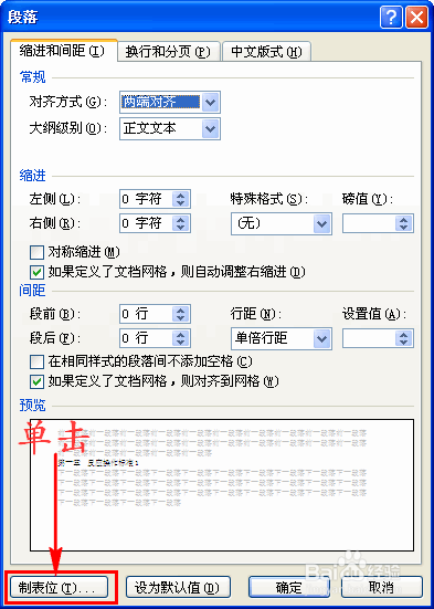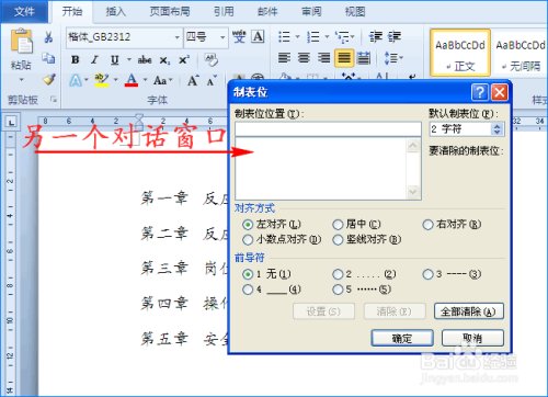 在对话窗口中我们点击“制表位”选项,这时又会弹出另一个对话窗口。如图所示: