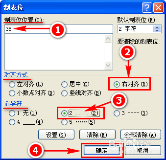 在“制表位”对话窗口的“制表位位置”下方方框中输入“38”,对齐体例选择“右对齐“,前导符选择第二种样式”.........(2)“,所有参数选择完当作后,我们再点击”确定“。如图所示: