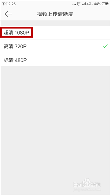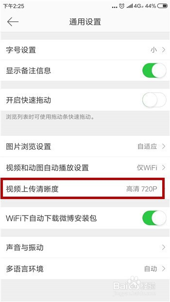 打开了的通用设置功能后就可以看到【上传视频清楚度】选项了,默认的是【高清720P】。