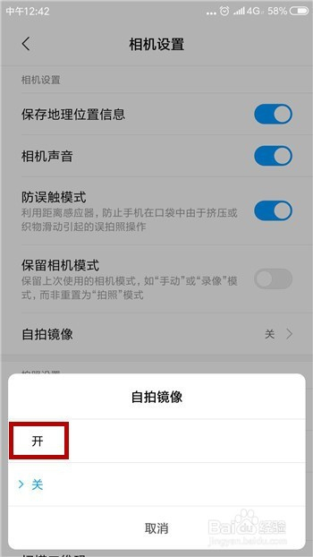 返回到相机的设置界面中,这时辰可以看到自拍镜像已经是打开的状况了。