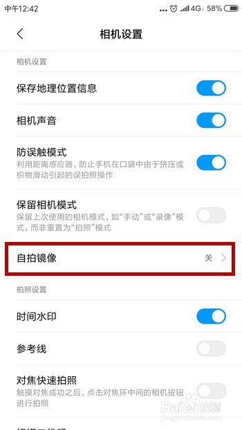 打开相机的设置功能后找到【自拍镜像】,这时辰看后方是否显示的是封闭状况,若是是的话点击这个选项。