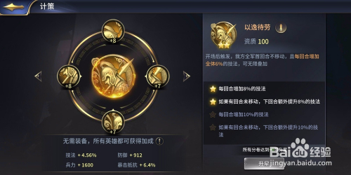 以逸待劳——该计策的感化是让己方不移动,让对方移动,晋升己方战队的技法,达到五星时战队技法可晋升15%。