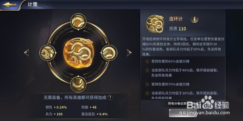 连环计——连环计是我最喜好利用的一个计策,这个计策可以让英雄受到的危险进行分摊,这种功能对于前排英雄来说是一种很是年夜的庇护。升到五星时,英雄受到的80%危险可以分摊给其他英雄。