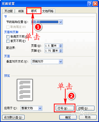 在弹出的“页面设置”窗口中我们选择“版式”界面中的“行号”选项,这时会弹出行号设置对话窗口。如图所示: