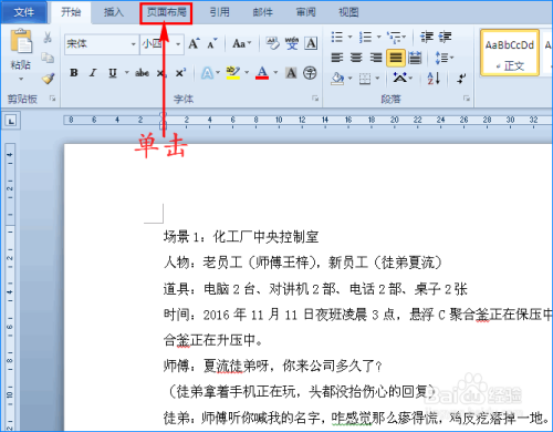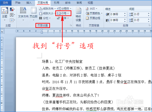 打开Word文档,我们点击本家儿菜单栏中的“页面结构”,然后在其子项“页面设置”组中找到“行号”选项。如图所示: