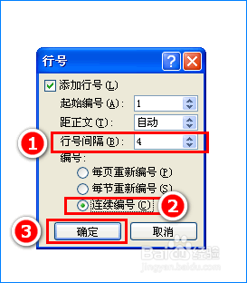 接着在点亮的窗口中,我们在“行号距离”处输入“4”,“编号”类型选择“持续编号”,最后点击“确定”(两个窗口都需点击确定)。如图所示: