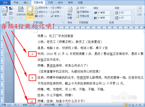参数设置后,我们返回文档会发现文档是按每隔4行进行标识表记标帜的,并且也能看出文档的总行数哦!如图所示: