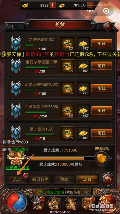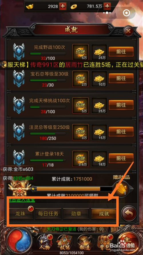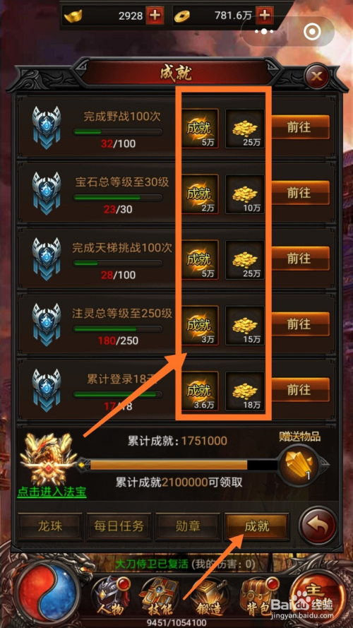 最后为大师讲解当作就使命,当作就使命包含良多,好比说完当作野战100次,宝石品级升至30级,可以获得金币和当作就点数,获得当作就点数之后,我们点击进级即可,如下图所示。