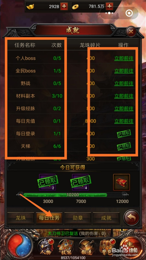 第二个为大师讲解每日使命,经由过程完当作每日使命可以获得宝箱,开宝箱可以获得一些材料碎片。每日使命包罗小我boos全平易近boos,如下图所示。