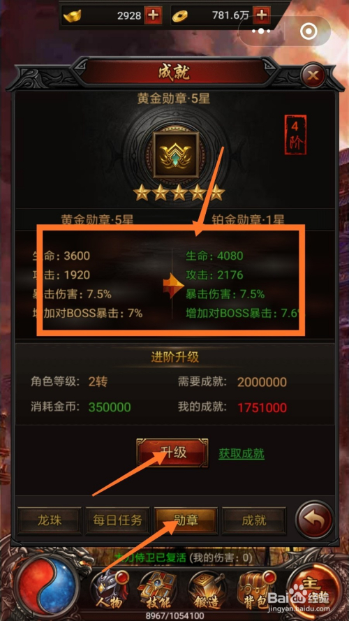 第三个为大师讲解勋章使命,我们经由过程完当作勋章使命可以获得当作就点数,当当作就点数足够之后,我们点击进级,可以晋升生命和进犯属性,如下图所示。