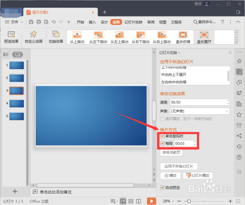 2、勾选单击鼠标时并设置每隔几多时候切换幻灯片,在未达到幻灯片切换时候点击可进行切换下一张;