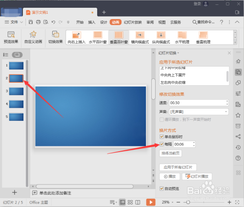 选择第二张幻灯片,设置每隔6秒切换幻灯片。