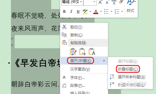 然后将文档中所有内容全数选中,而且点击鼠标右键依次选择“睁开/折叠”-“折叠题目”,如图所示...