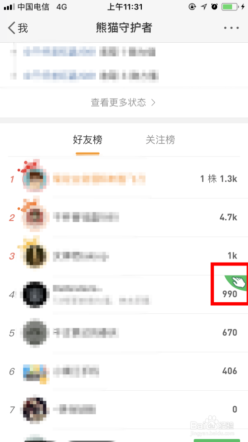 然后,在 老友榜 里面若是看到有小手图标,就代表这个老友有微粒值可以收取。点击 小手图标 。