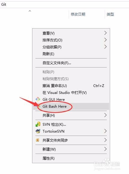 在E:\Git下,我们右键选择“Git Bash Here”,如下图所示: