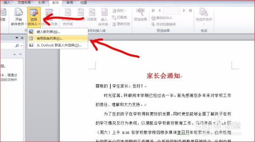 在“选择收件人”下拉菜单中,选择“利用现有列表”。