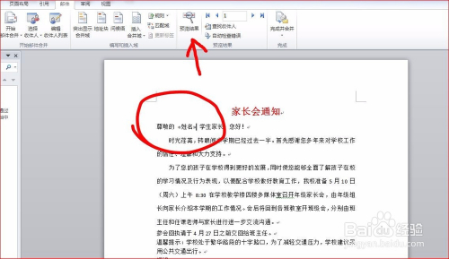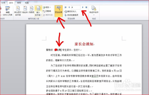在上一个步调之后,之前光标定位的位置就会呈现《姓名》字样,点击“预览成果”即可查看名字的插入结果了。