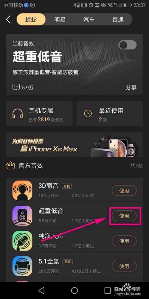 这时便进入到了蝰蛇音效页面,在该页面中找到超重低音选项,电击厥后面的【利用】按钮。