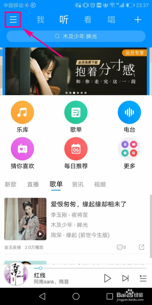 跳过告白页面今后就进入到了酷狗音乐首页面,在首页面左上角位置点击图示的三横线图标。