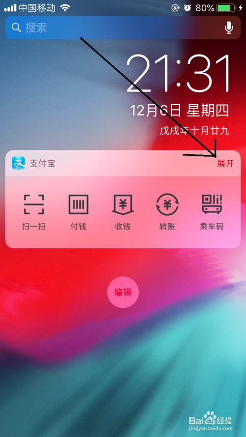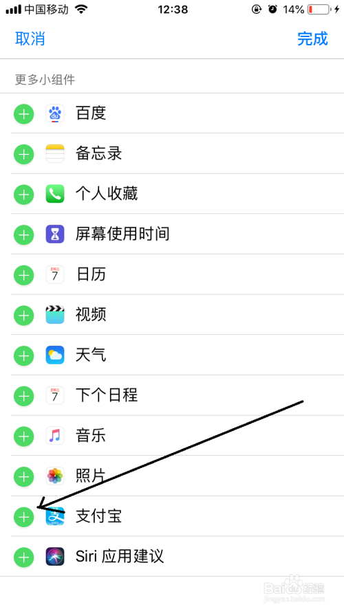 切换到添加小组件界面,在这个界面中找到付出宝软件后点击前面的加号。