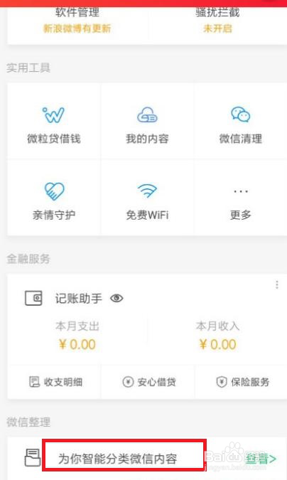 进入微信清理页面后,可以看到“为你智能分类微信内容”按钮,点击该按钮,就可以开启“微信智能清算功能”。