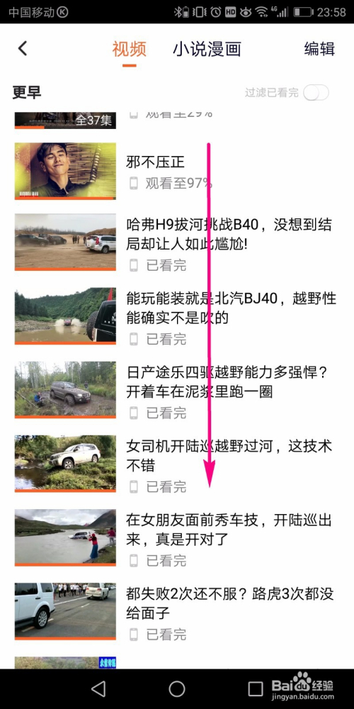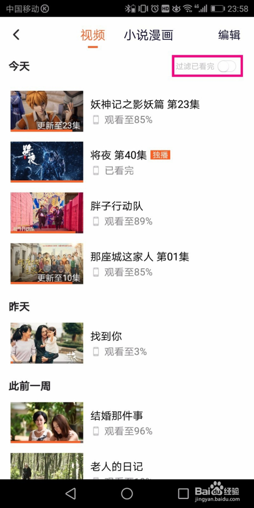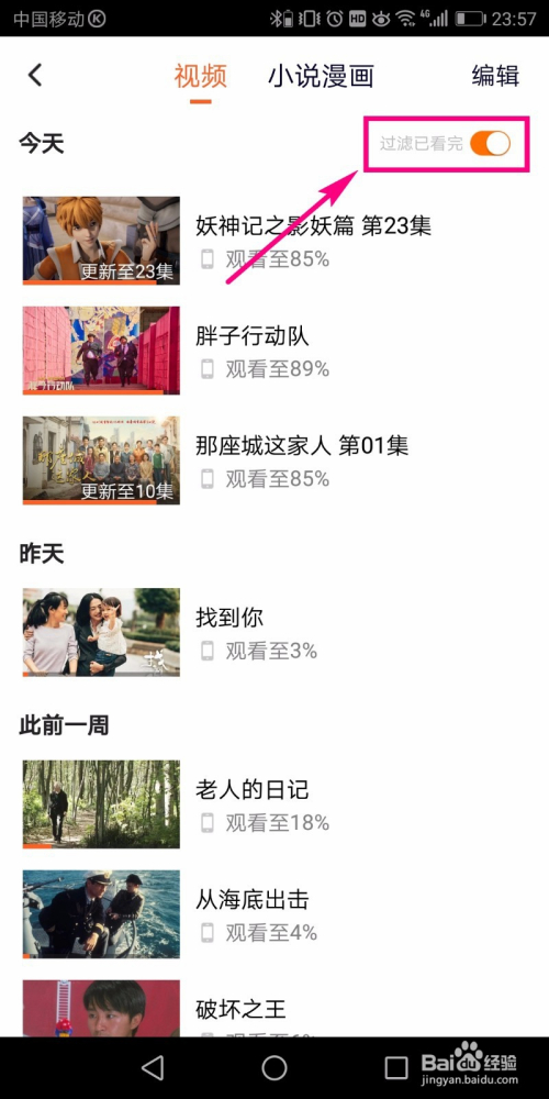 这时进入到不雅看汗青页面,当前在页面中显示的是没有看完的视频的记实,看完的已经被过滤失落了。我们需要点击图示位置滑块(默认状况下软件是将看完的视频过滤失落的),封闭该功能。