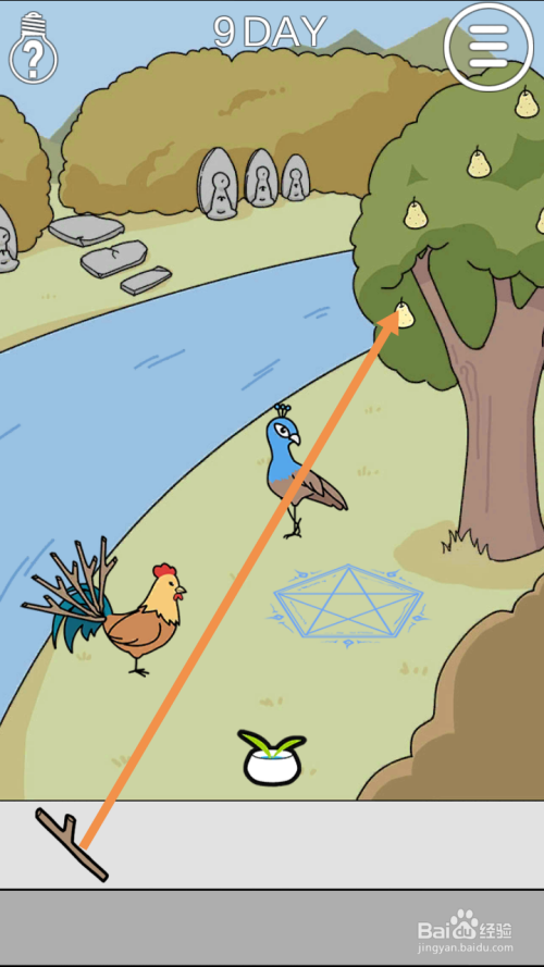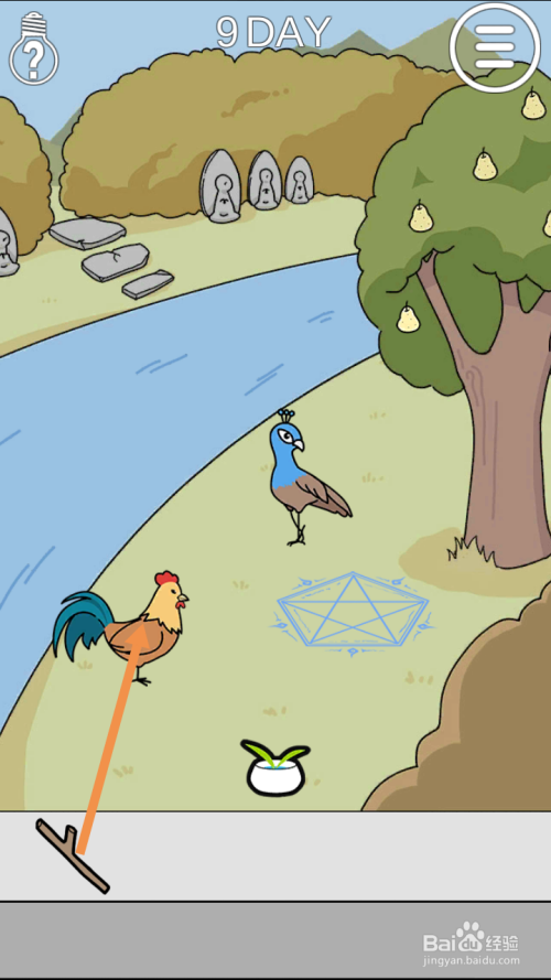 第9关点击树枝,然后将树枝拖动到鸡身上。