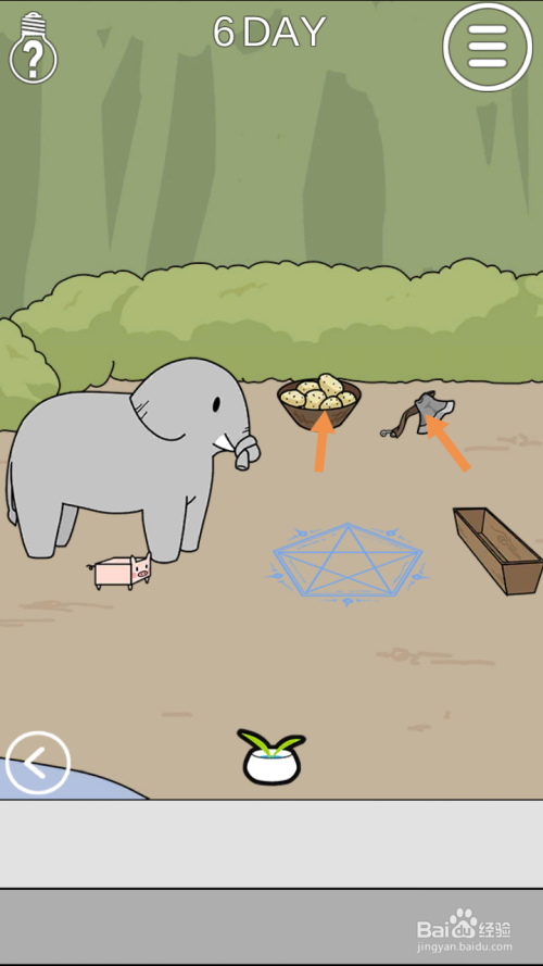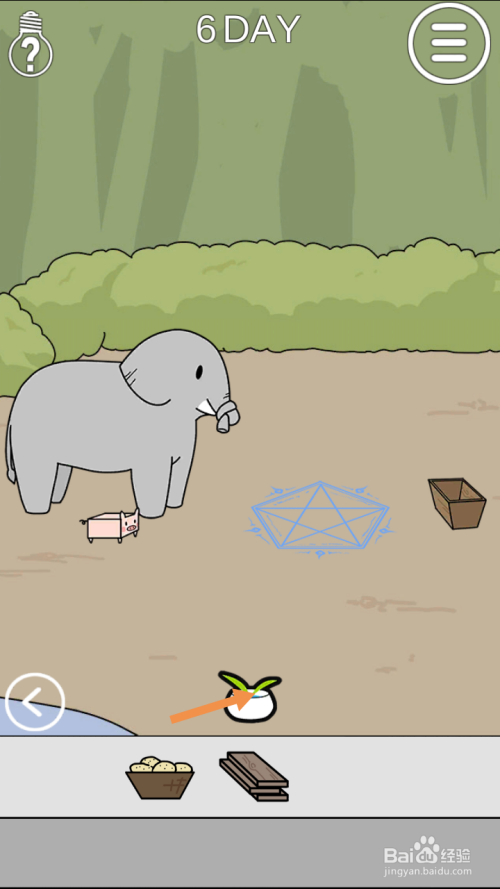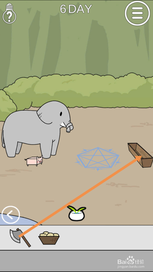 在右边点击斧头和猪饲料,然后将斧头拖动到年夜象鼻子处。