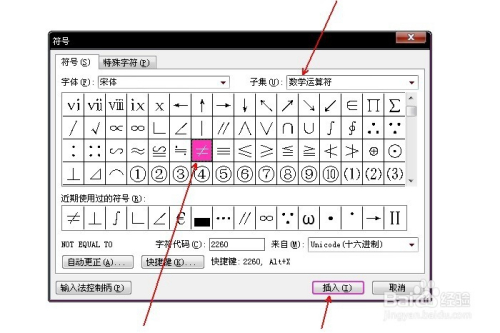 在“子集”中选择“数学运算符”,鄙人方选中不等号,点击“插入”。