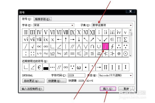在“子集”中选择“数学运算符”,鄙人方选中不定积分符号,点击“插入”。