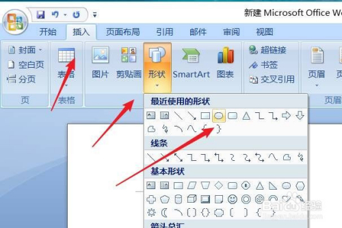打开Word文档,在功能区内依次点击“插入”--“外形”--“椭圆”。