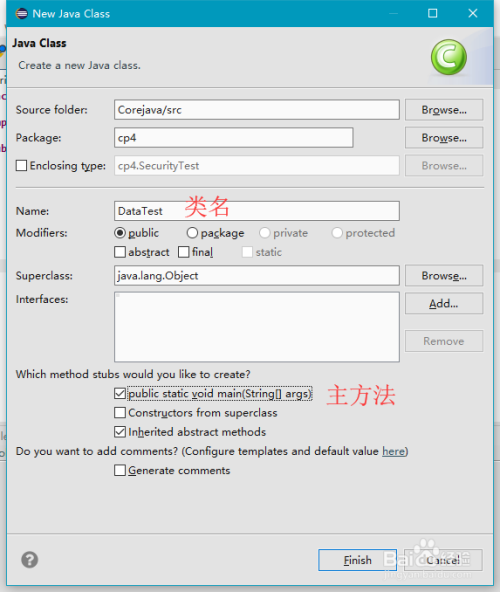 在弹出来的“New Java Class”新建类窗口中,可以对欲添加的Java类的类名和实现的接口进行界说,需要注重的是类名的定名要合适Java标识符的规范,如“DataTest”,并勾选主动建立本家儿方式