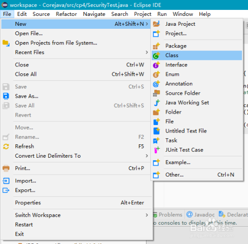 首先我们打开Java的IDE Eclipse,这里以常用的Eclipse软件为例,在一个建立好了的Java工程中,或者本身另行建立一个新的java工程项目,经由过程点击File-New-Class,即可新建一个通俗的Java类