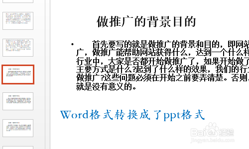 然后适才的Word文档就会主动转换为ppt格局了,双击打开今后我们会看到之前的Word文档已经按照ppt的格局显示了;