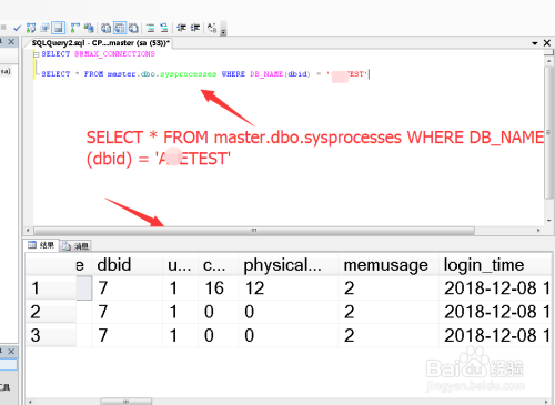 SELECT * FROM master.dbo.sysprocesses WHERE DB_NAME(dbid) = 'XXXTEST'