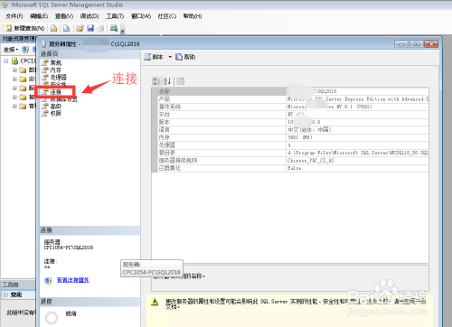 在弹出的办事器属性画面,找到毗连并点击查看毗连中的具体信息。