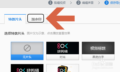 如许就来到了视频导出页面,也就是最后一个环节了,我们看到此页面右上角有一项“加水印”,默认的是加图片水印,我们将前面的勾选去失落,然后“起头导出”,如许建造好的视频就不会显示有关快剪辑字样的水印了;