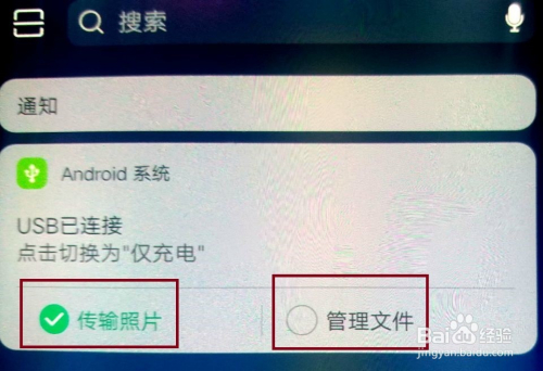 然后下拉通知栏,在通知栏中找到“USB已毗连仅充电”选项、“传输照片”选项以及“办理文件”选项。