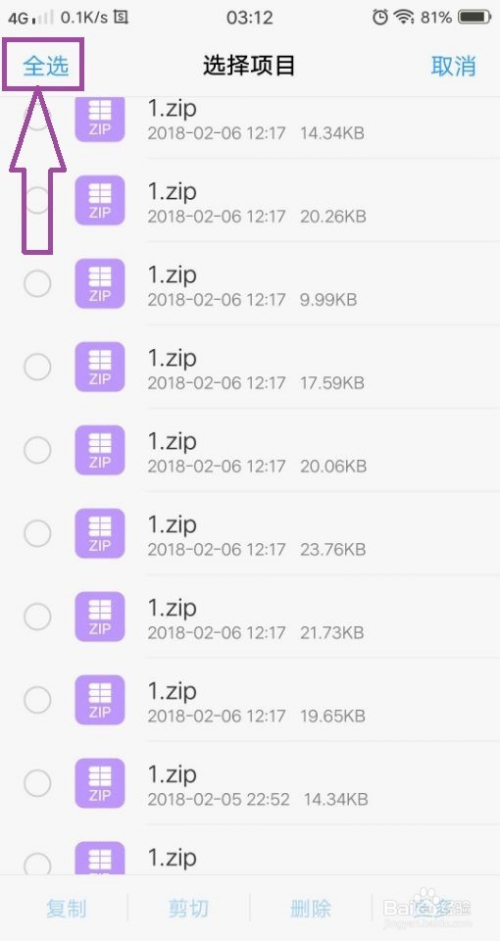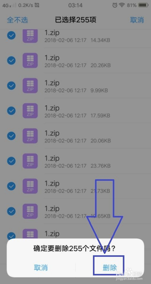 点击“全选”,将所有的压缩包全数选中,然后点击页面下方的“删除”,将压缩包全数删除。