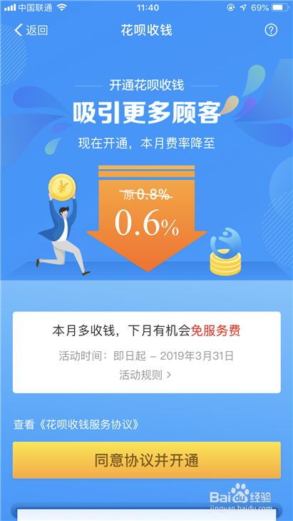 确定无误之后,我们点击下方的赞成和谈并开通,我们就可以获取花呗收条目的权限了。