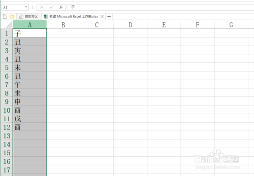 为了便于理解,教程以下列数据为例,将A列中非初次呈现的数据进行字体或单位格颜色标识表记标帜。