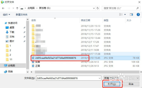 在打开文件对话框里面找到证件照片选中后点击【打开】