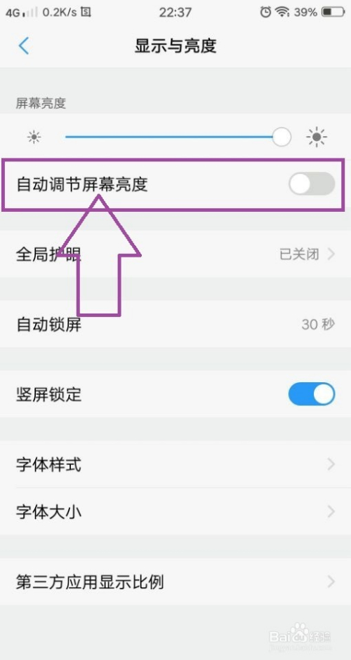 然后将“主动调节屏幕亮度”封闭,因为若是主动调节屏幕亮度的话,可能使我们的手机屏幕亮度不敷,从而导致视频的亮度不敷。