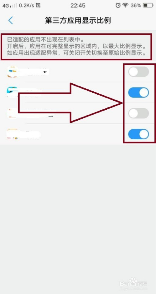 最后点击“第三方应用显示比例”,进入到第三方应用显示比例的页面,在页面上找到手机的应用法式,开启手机应用法式的适配比例,使得应用在可完整显示的区域内,以最年夜比例显示,如许既可解决视频亮度的问题。