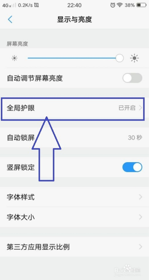 点击“显示与亮度”,进入到手机显示与亮度的设置页面,在页面上我们可以设置屏幕亮度、主动调节屏幕亮度、全局护眼、第三方应用显示比例等等。