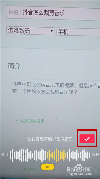 在裁剪音乐的界面中黄色部门暗示在利用的音乐部门,拖动即可裁剪音乐,裁剪好后点击【√】。