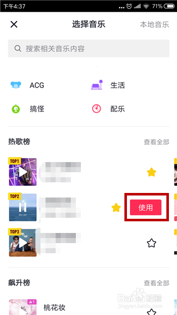 打开音乐界面后选择一个音乐并点击,然后点击【利用】。