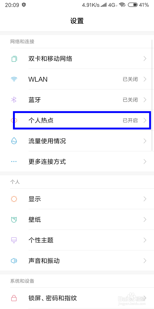 进入设置后,找到“小我热点”这个选项,点击进去。